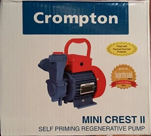 The Crompton Mini Crest II is a popular 0.5 HP (0.37 kW) single-phase, self-priming regenerative monoblock pump designed for residential water supply, including overhead tanks, gardening, and pressure boosting. It features a compact, durable construction with high-grade materials, a 3000 RPM motor, a head range of 6–21 meters, and is equipped with thermal overload protection.